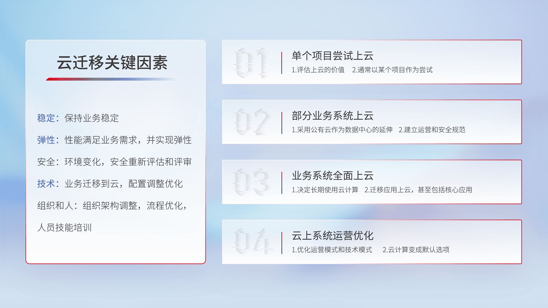 结合实际业务,,从规划设计、、、云平台选型、、、云原生改造、、、、数据迁移、、、集成交付,,,,迁移全过程为客户识别最佳上云路径,,,做好风险识别管理,,设计网络架构、、、身份权限、、、安全审计合规、、操作审计、、、日志审计、、、监控告警策略、、、、多站点容灾设计等,,对云上基础设施进行整体规划,,,提升IT治理水平,,,,以满足弹性、、、、高可用、、高性能的需求。。